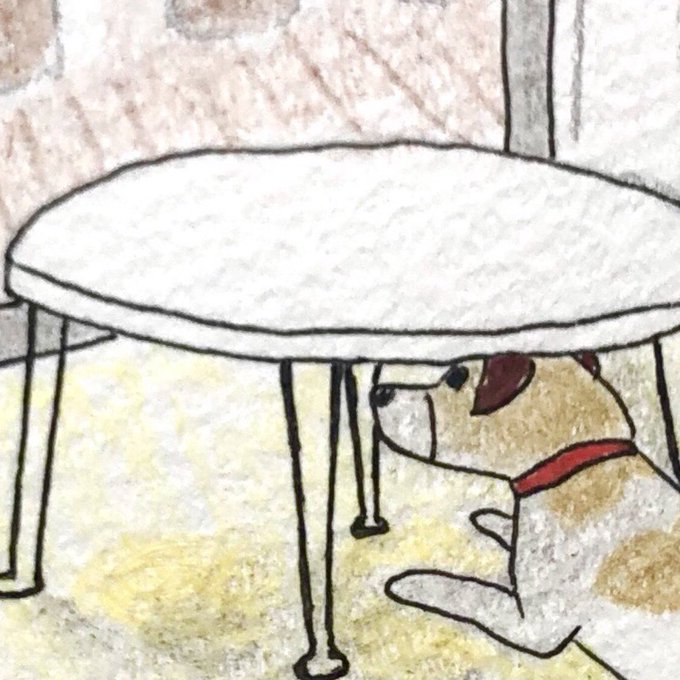 トト隊長、テーブルの下に潜って外を偵察しているようです🐶