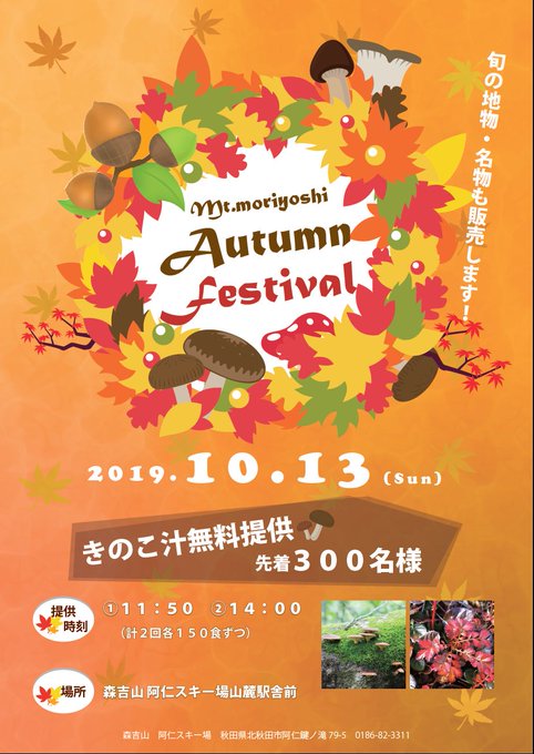 10月13日(日)、森吉山阿仁スキー場の山麓駅舎前にて、秋まつりが開催されます!先着300名様にきのこ汁を無料提供します(^^♪