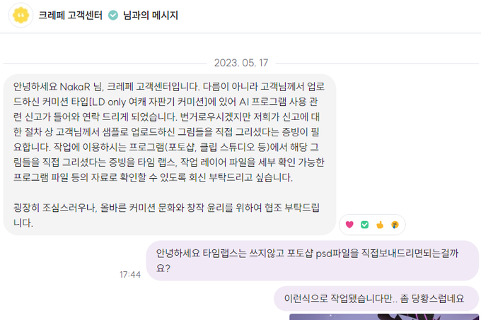 크레페에서 제가 올린 샘플그림에 대해 AI 신고가 있었고, 이에 대해 해명 겸 공유를 위해 업로드합니다.