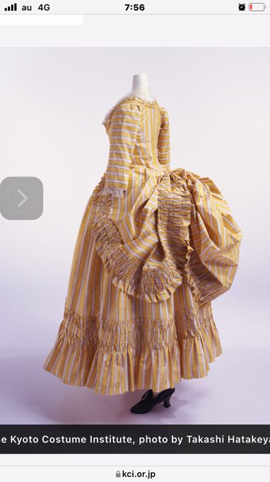ちなみに、ヒップを盛り上げ今日にするスタイルは、ロココ末期からあり、当初は長すぎる裾を捲って動きやすくしたこと(1枚目)から、その後、洗練されてポロネーズスタイルとなり、100年後のクリノリン末期に広がりすぎたスカートの次のシルエットとしてリバイバル(3枚目、4枚目)。