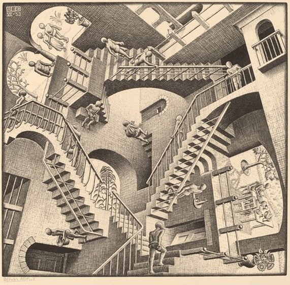 M.C. Escher is an artists whose work explored different levels of reality. Much of his work explored conflicting, points of view and impossible structures, hence his popularity amongst scientists and mathematicians.