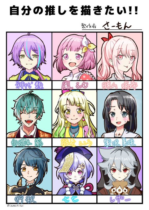 それぞれの絵柄が全然違かったので大変でした。 いろんな人と繋がりたいです! #絵描きさんと繋がたい #イラスト #イラスト好きさんと繋がりたい #プロセカ #神代類 #鳳えむ #暁山瑞希 #ヒプマイ #白膠木簓 #バンドリ #ガルパ #弦巻こころ #奥沢美咲 #原神 #行秋 #七七 #レザー