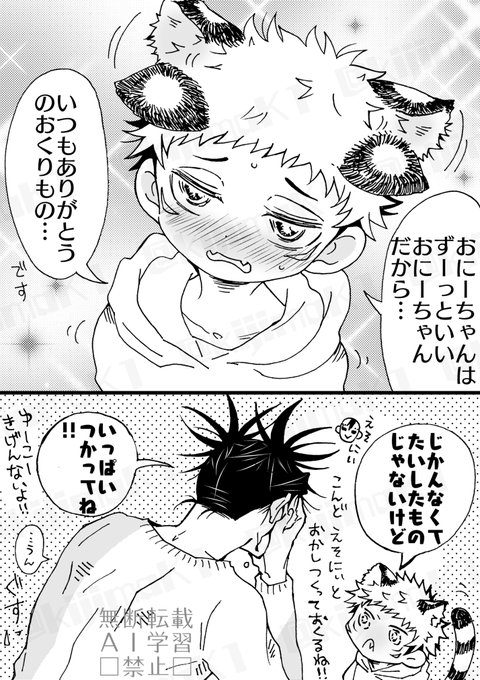 脹虎🩸🐯1/22のショタケモゆじ君とお兄ちゃん。最後だけ体は大きくなっても基本は変わらないケモゆじ君(お兄ちゃんは人外よりなので不老です)
