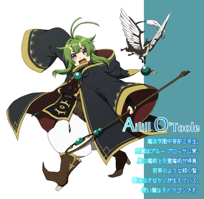 魔法学園中等部2年生:所属はブルー・ブロッサム寮。風の魔術と交霊魔術が得意。特徴→若草のような緑の髪、額に小さなツノが生えてる。使い魔は子ドラゴンです