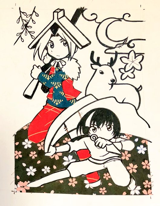 和のイメージということでアキタ👹&シノブ🐗の東北組で…こんな感じで和紙を切り貼りしてつくってました