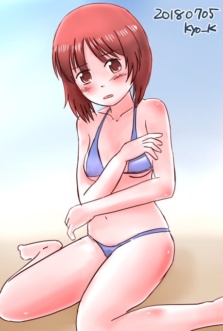 #ガルパン版深夜のお絵描き60分一本勝負 #ガルパン版深夜のお絵描き60分一本勝負_20180705 お題「西住みほ」#ビキニの日 って事で西住みほさん大胆ビキニで恥ずかしがる感じで。