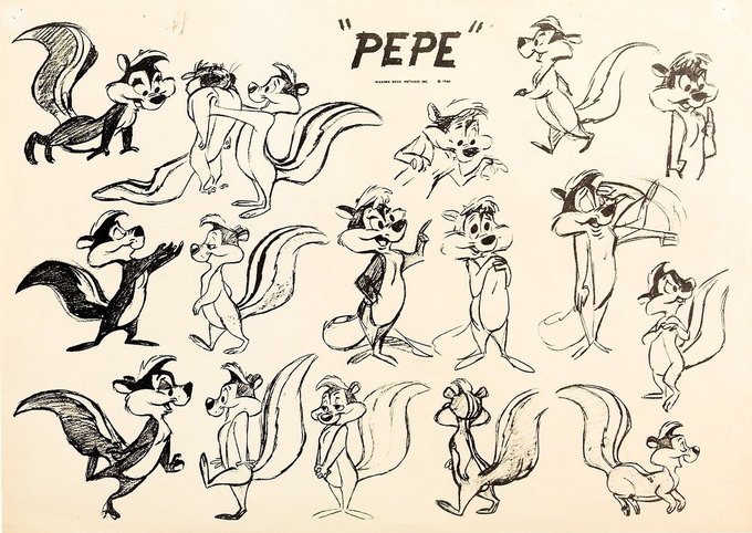 Model sheet, color guide & backgrounds for the final Pepé Le Pew cartoon: "Louvre Come Back to Me!"