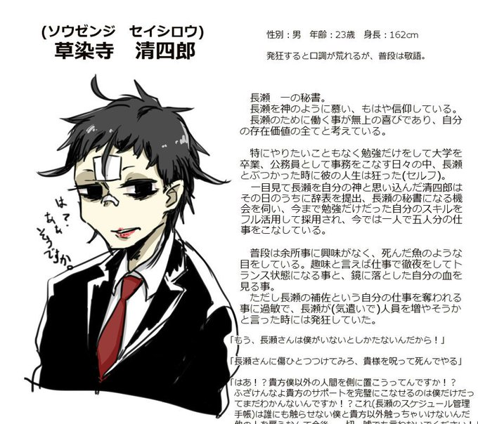 @Yuizen_Ymit キャラシ失礼します!二人目です。【草染寺 清四郎】長瀬の秘書(狂信者)です、親も引くレベルで気持ち悪い子ですがよろしくお願いします。