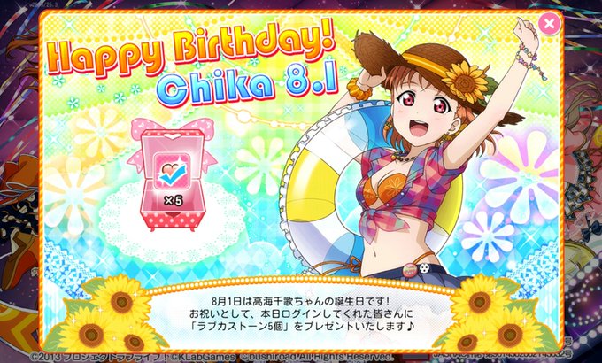 千歌ちゃん誕生日おめでとう🎉自分の推しキャラの誕生日はいいよね。もうすぐ名古屋でライブがあるけど現地には行けないのでLVで応援します。千歌ちゃん頑張れ👍 #高海千歌生誕祭2017