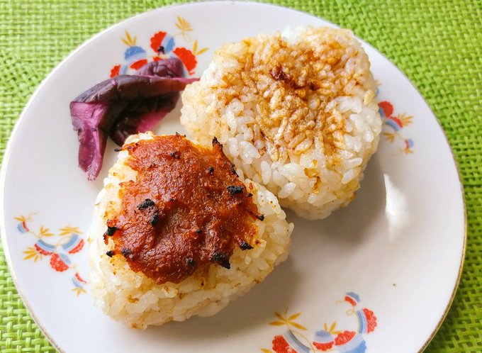 我が家は合わせ味噌を乗っけたタイプとカツオ節&醤油をご飯に混ぜたねこまんまタイプを握って魚焼きグリルで両面をカリッと焼いてます(人*´∀`)。*゚+