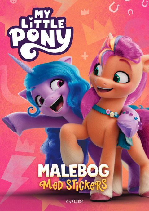 "Coloring book with stickers" in Danish. Another use of the new logo, and the first time this promo render has been used with rainbow hair in Sunny's mane. The book's release date is today, January 20.