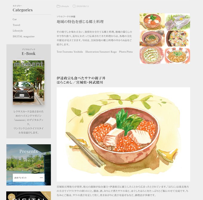 トヨタの上級ブランド「レクサス」のWEBマガジン『moment』(レクサスカード会員限定のサイト)でイラストを描かせて頂きました。「ソウルフードの神髄」と題して郷土料理を水彩で描いています。