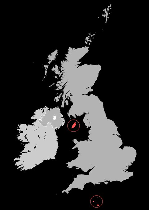 右からマン島、ジャージー代官管轄区、ガーンジー代官管轄区、最後の2つはチャンネル諸島に属する。歴史的にイギリス王室の所有領土であり、連合王国には含まれない。そのため、それぞれ、独自の政府、通貨、議会を持つ。外交と防衛はイギリス政府が行う。EUにも属さない。