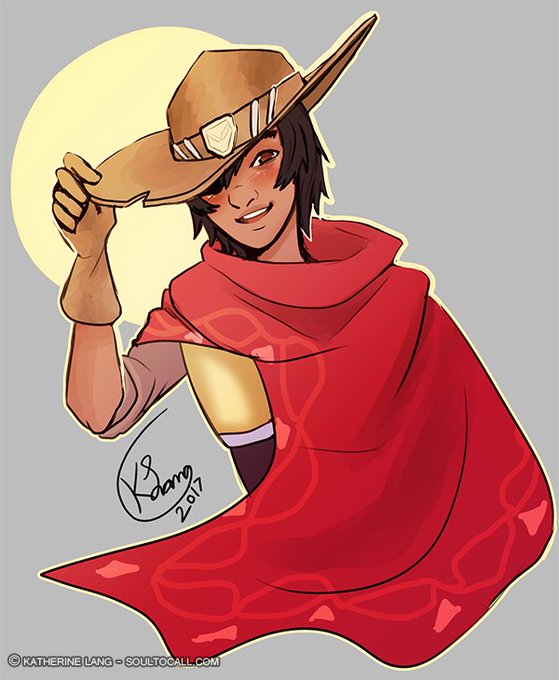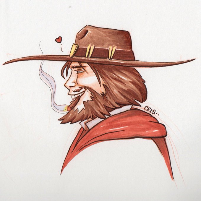 Eli would enjoy cosplay, so I drew him dressing as McCree to cheer myself up. McCreEli, if you will.