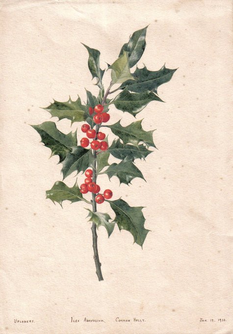 A glossy sprig of Christmas Holly from Diana Ruth Wilson (1886-1969). As a girl, she took a posy of Dorset holly and hellebores on the ship bound for Rio, to ward against homesickness on her plant hunting trip #BotanicMonday #womensart #wildflowerhour #Christmas