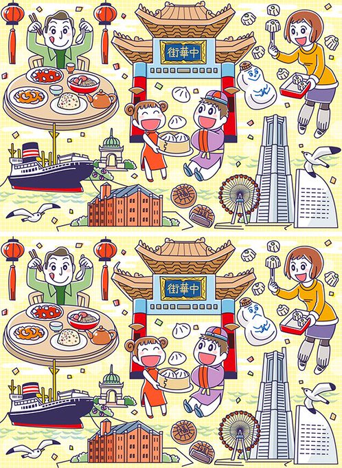 間違い探しです。ファミリーが国内を観光するというテーマ。