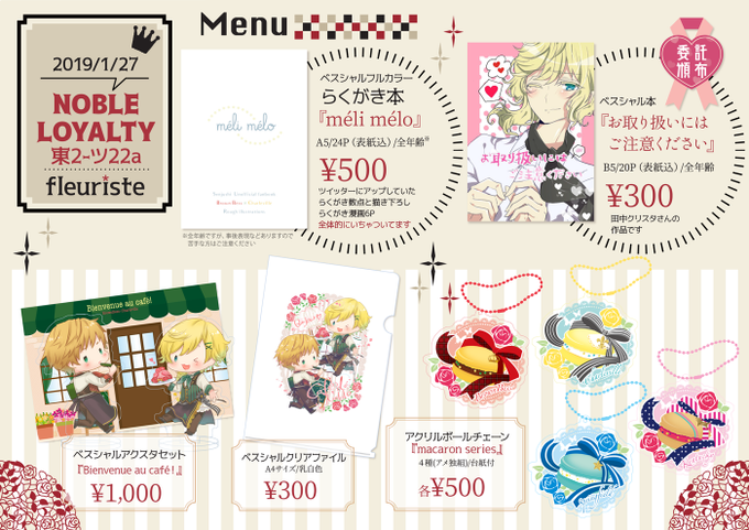 お品書き改正版です!当日は本を受託させていただいている田中さん(@crysta_tanaka_)と一緒にスペにいます!宜しくお願い致します(*´ー`)