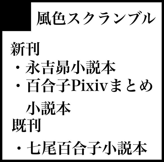 新刊永吉昴小説本、七尾百合子短編集、既刊七尾百合子小説本を頒布します。