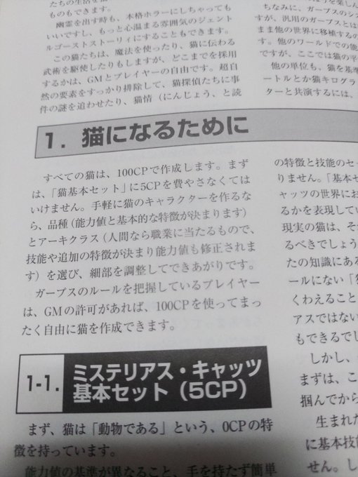 猫になって遊ぶTRPGと言うとミステリアス・キャッツを思い出します。ご町内の不思議な事件を猫武術や魔法を使ったりしながら解決します。