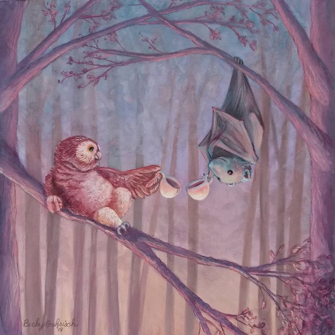 I'm pleasantly surprised by how this turned out 😆☕🦇🦉 #owl #bat #owldrawing #artist #carandacheluminance #coloredpencilart #coloredpencil #cp_art #whimsyillos #whimsicalart #illustrationforkids #illustrator #illustrationart #kidlitart #womenartist