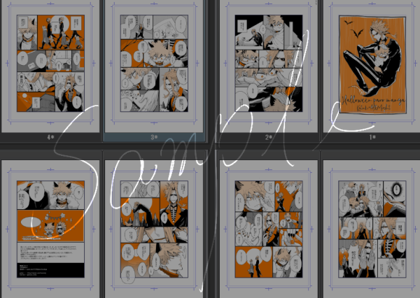 週末の出番のおしながきと無配サンプルです!新刊はございませんが、8P折本(2色刷り予定)を卓上に置いておきますのでご自由に持って行っていただけますと幸いです。無配は全年齢かつおるハロウィン漫画です~