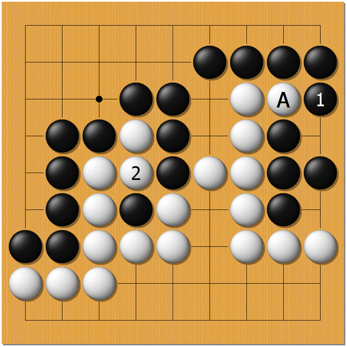 3枚目のように黒石があれば左上後手五目に先着できますが、4枚目のように白石のみだと黒三つがピンチなので、黒1と取る必要があります。
