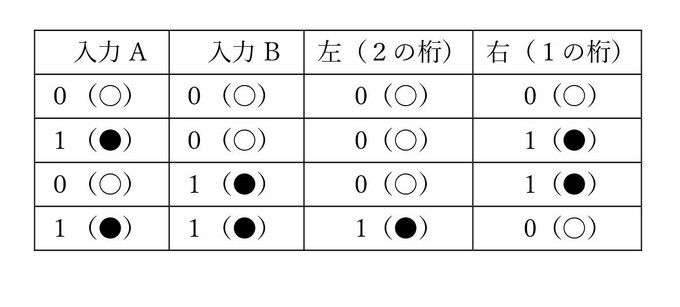 2進数で、0+0と0+1と1+1ができるものです。
