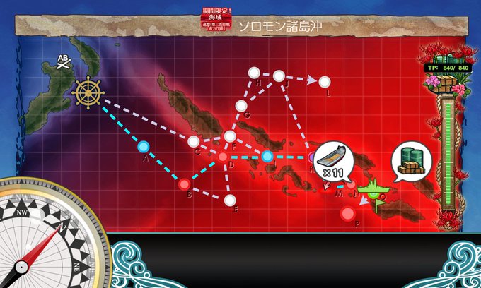 特効艦のCIにすべてを賭けるステージです。夕立か綾波なら1人でボスを落とせるので、夜戦開始時に1人でも残っていれば諦めずにやった方がいいです。