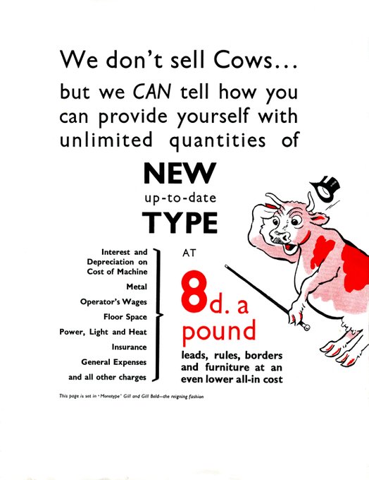 Battle of the Cattle: In the summer of 1933 Stephenson Blake attacked the idea of having a Monotype machine to cast your own type. They likened it to buying your own cow to provide milk. Monotype retaliated within weeks, using the same cow analogy to promote their own machines.
