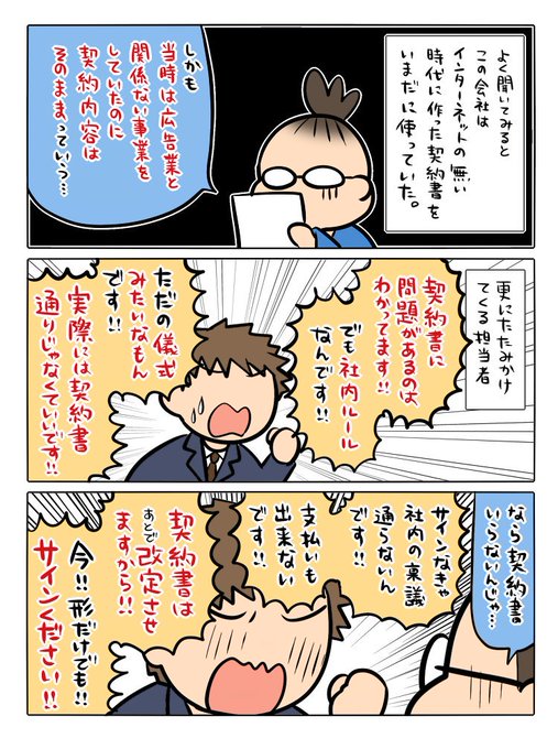作画担当がKDPの拙著「広告まんが道の歩き方」を漫画化してくれたPart20。またしても実話。めちゃくちゃな契約書にサインできるわけないじゃん。なのに泣き落とそうとしてくるだけでラチがあかなかったら、ご破算にさせてもらったの・・・