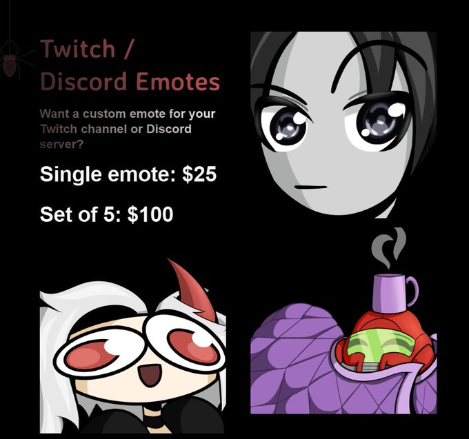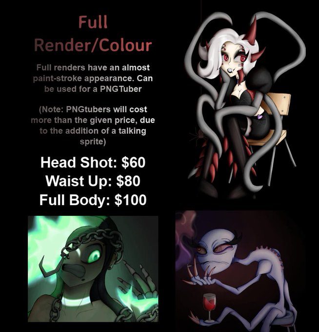 Linked carrd in following tweet includes TOS and more examples! Full colour renders, Twitch / Discord emotes, and *drumroll* testing out Starting Soon screen animation comms!