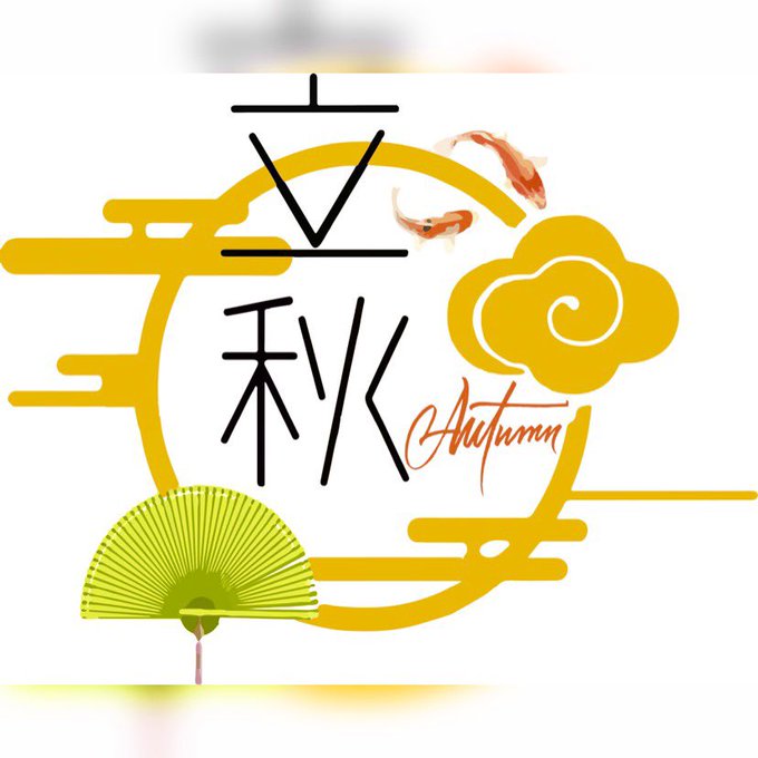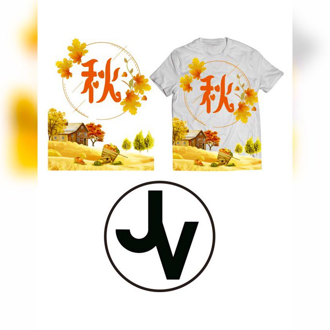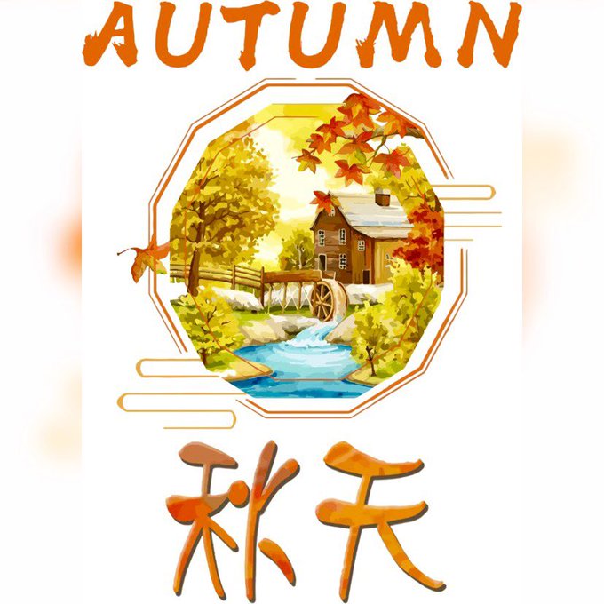 A circle display a lovely autumn panorama of farmland within a single typographic text and pair of orange kanji letters.