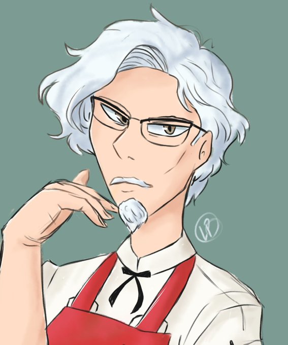 Now that I've got to voice Colonel Sanders in @EileMonty's stream of the KFC dating sim, I have a STRONG need of some fanart of me and him standing together 🤣
