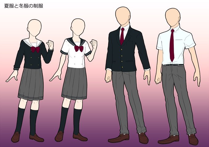 NO.614 茨城県立牛久高校(牛久市)の制服イラスト!ブレザー着用時はリボンを付けるルールで、正装時のリボンはエンジ、普段は紺も選択可能です。夏季はニットベストが正装。左のベストはオプションです。絵師は@azuuuuu__さん!