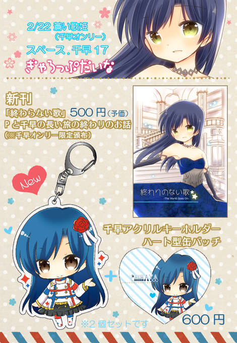 2/22千早オンリー蒼い歌姫のお品書きです。【スペース.千早17 ぎゃろっぷだいな】新刊の方は千早オンリー限定頒布になるかもしれません