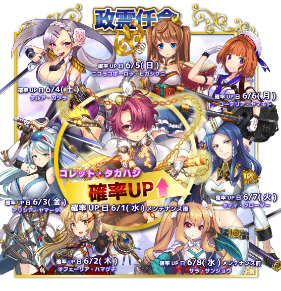 また、全国の総理のご要望にお応えし、6/1〜6/8の期間、既存政霊の日替わりピックアップガチャを開催する予定です。