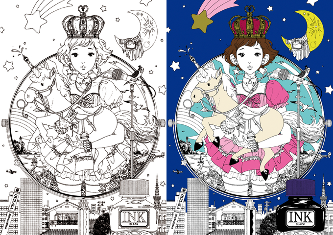 【③線画&着彩】『きららちゃん』発売前夜はいよいよ最終段階。バロンケント紙の鉛筆下書きの上からコピックマルチライナーでペン入れ(左)。それをパソコンに取り込みフォトショップとマウスで少しずつ色を乗せてゆきます(右)。#きららちゃん