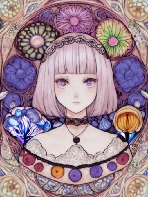 昨年に少し研究していた菌糸ネットワークとレースを組み合わせたパターン模様。mushroomsとmycelium networkからAIさんが何となくミュシャを連想するのか、絵のタッチが似てくる気がします。#trinart