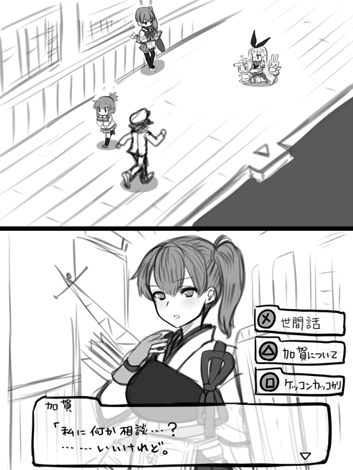 艦これ改はこの際めいいっぱい延期して、こういうアドベンチャーパート作って欲しい。鎮守府内を歩けて艦娘と会話して好感度上がったらケッコンカッコカリできたり、自室に艦娘が来て特別な会話聞けたりとか。歩き回るパートはドットでオナシャス。
