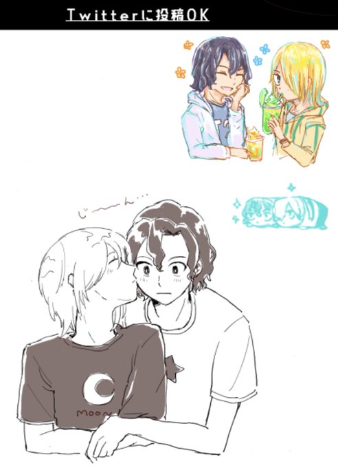 手青絵チャ、ほっぺチュ〜とプール掃除はふみともさん(@roly_poly2) の絵で、サマーな手青とモチちゃんは葉助さん(@ha_ppppa64)の絵です!画面が全部可愛いまみれでした☺️✨