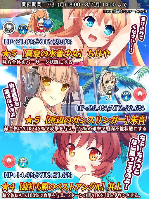 「☆5【真夏の水着少女】ちはや」や「☆5【浜辺のガンスリンガー】朱音」など水着をテーマにしたスキルカードが登場!