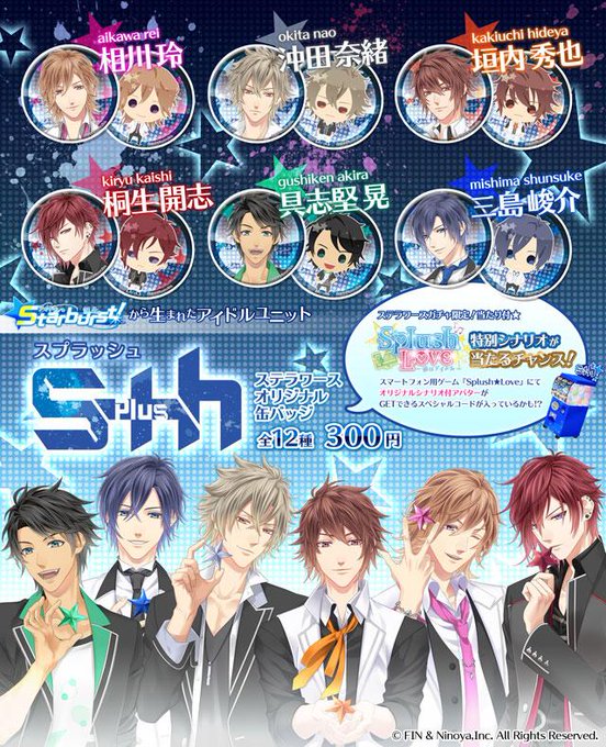 グッズに関してもうひとつお知らせ!CD発売に先がけ、2月6日(金)から池袋ステラワース様限定で「S+hデビュー編缶バッジガチャ」稼働開始予定です。なんと当たり付!スプラブで読める特別シナリオ付アバターがもらえちゃいます♪ #スプシュ