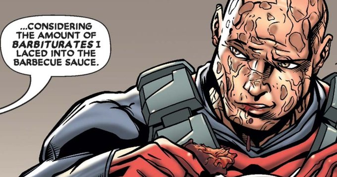 시니스터가 데드풀 보고 뮤턴트가 맞다고 한 이유는 신경 마비 독이 가득 들어간 음식을 대량 섭취했으나 인간과 달리 어떤 중독 증상도 보이지 않아서였다고 합니다. 그의 말에 금방 놀람을 잠재우고 기분 좋은 표정 하며 마저 독 든 음식을 먹는 데드풀이 귀여워 보이네요. 역시 인정받고 싶었구나..