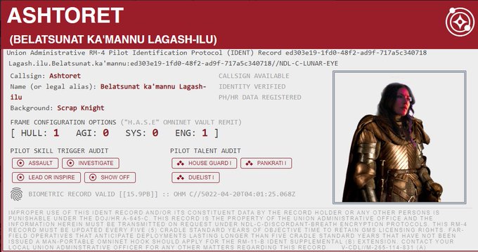 C//mm piece: #LancerRPG pilot Isacia Mahuta Sparrsdottir, former Espada