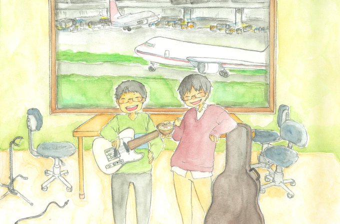 おばんですw眠れる森のアフロです。チョコと生クリームにシナモン入りホットチョコレートをイメージw線画も。あと昨日のイラスト聡一さん左足塗ってたのと貴秋さんの鼻下が黒すぎたの修正w #BRADIO #イラスト #貴秋のココ空いてますよ