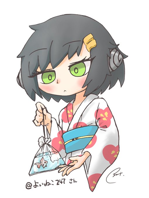 よいねこ( @yoineko41 )さんちのザクロさんファンアート〜〜以前から描きたくてたまりませんでした!時折、おまけでもらった金魚の様子を見ながらお祭り楽しんでそうって妄想です…失礼します…!
