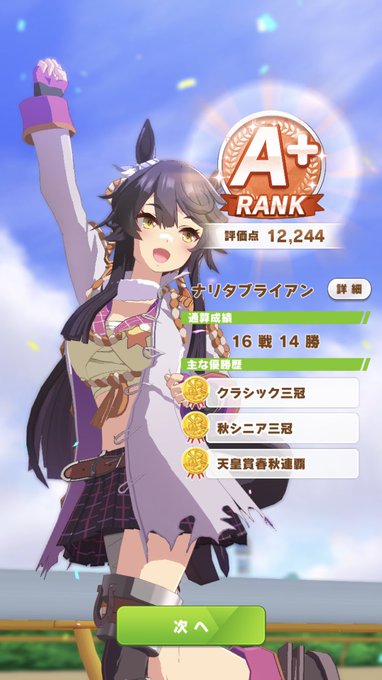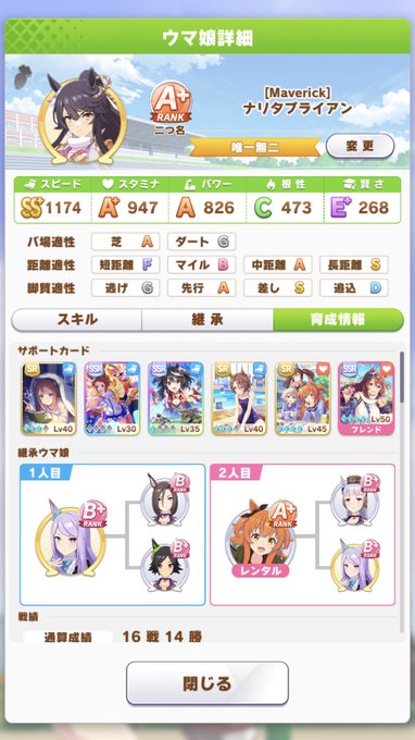 ジュニアデビュー戦で2連続5着をかまし、URA因子も継承出来なかったけど、ナリタブライアンで初のA +!やーー‼︎ このサポートデッキ、何となく練習固まってくれて、友情トレーニング発生しやすかった気がする。
