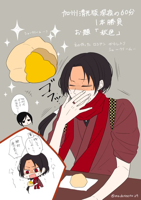 #加州清光版深夜の60分一本勝負 (@kiyomitu1dr) お題「秋色」→「からし色」→「からしシュークリーム」 的な・・・。 ありがとうございました!