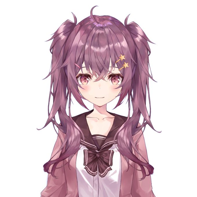 詳細はツインテ、前髪右側に星の髪飾り2つ、頭のてっぺんと髪の結び目にアホ毛です。