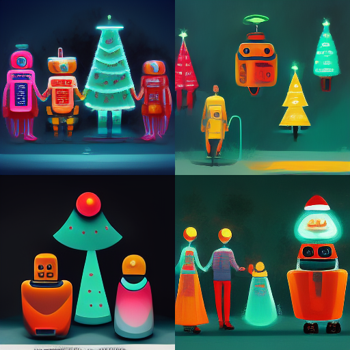 Feeling festive, so today's @OpenAI test has a Christmas theme. It's an interesting result and hits the prompts. Even the robot looks happy. The #Midjourney version (#4) is different, while still hitting the prompt. In a weird way, it feels like Katamari Damacy.